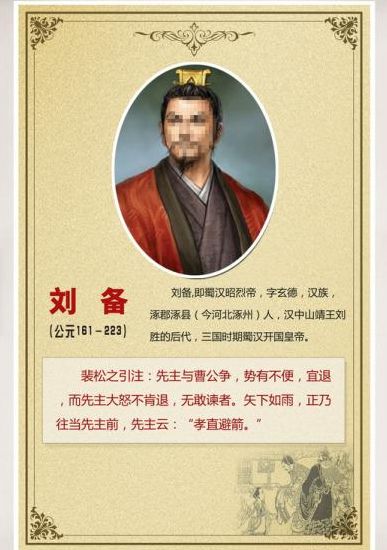 刘备(公元161年-公元223年6月10日),字玄德,东汉末年幽州涿郡涿县(今河北省涿州市)人,自称为西汉中山靖王刘胜的后代,三国时期蜀汉开国皇帝,政治家,史家又称他为先主。