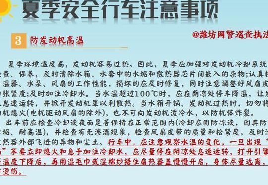 3、大热天开车有哪些注意事项?防止发动机过热:夏季环境温度高时,发动机容易过热。因此,夏季应加强发动机 冷却系统 的检查和维护,及时清除水箱和水套内的水垢以 高温天气行车注意事项解析 炎热的夏天,气温突然升高,汽车容易出现故障。
