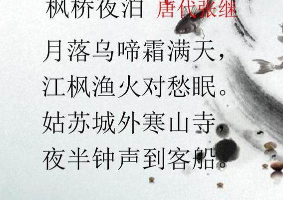 译文:月亮已落下乌鸦啼叫寒气满天,江边枫树与船上渔火,难抵我独自傍愁而眠。姑苏城外那寒山古寺,半夜里敲响的钟声传到了我乘坐的客船。原文:枫桥夜泊 唐代:张继 月落乌啼霜满天,江枫渔火对愁眠。