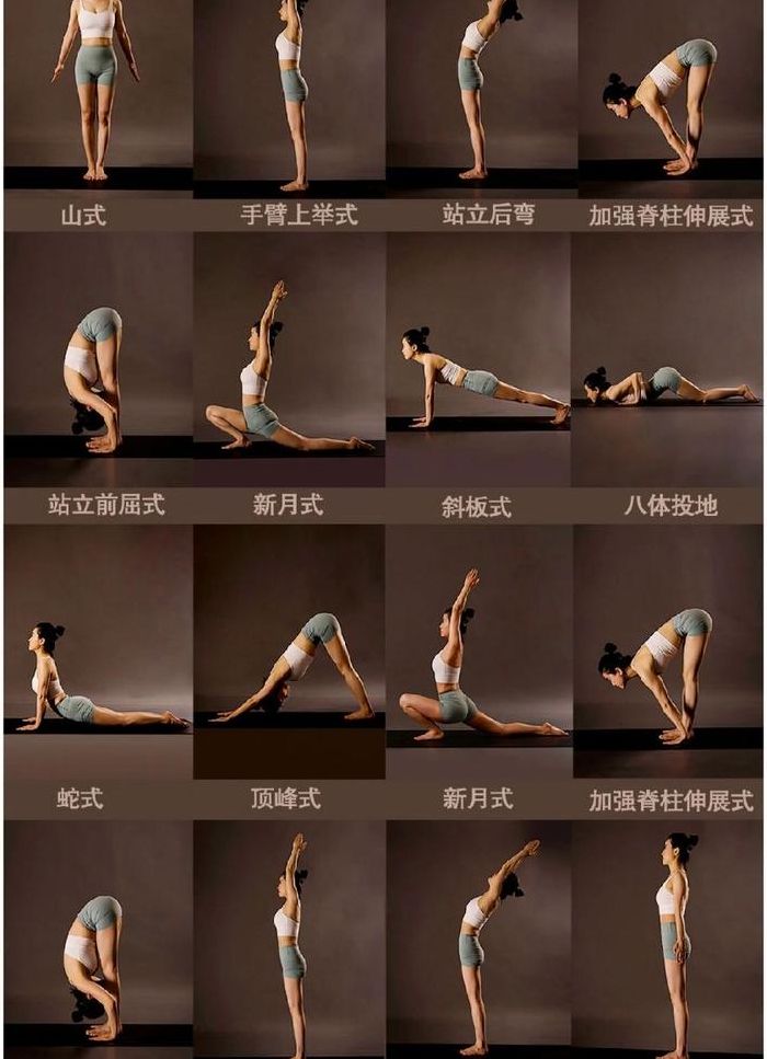姿势一:祈祷式 做法:挺身直立,双脚并拢。双手胸前合掌。放松全身。调匀呼吸。益处:建立集中和宁静的状态,为要做的练习做准备。姿势二:展臂式(双臂向上举)做法:举起手臂高过头顶。双臂分开与肩同宽。