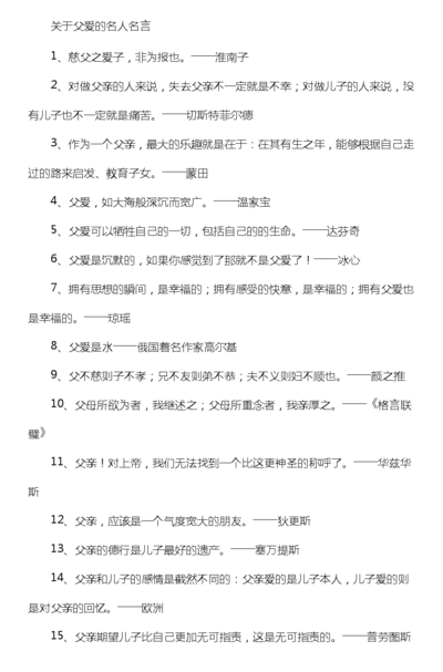 父爱是高山,即使在最困难的时候,也鼓励我挺直脊梁。 1没有哪一个人真正了解自己的父亲,但是,我们大家都有某种推测或某种信任。米南德s 1父爱如伞,为你遮风挡雨;父爱如雨,为你濯洗心灵;父爱如路,伴你走完人生。申宝峰。