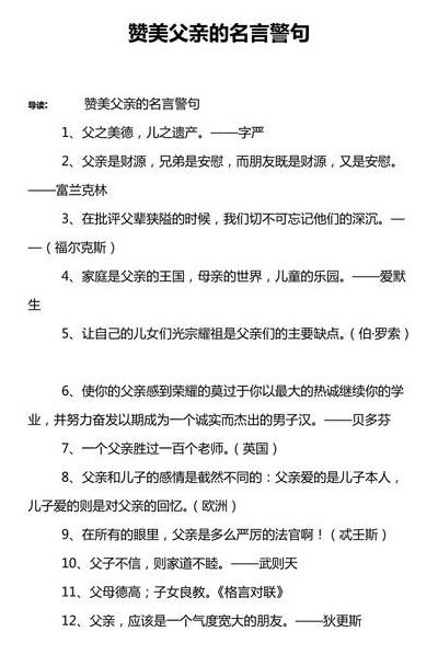 4、赞美父亲的名言 父爱是水。——高尔基 父之美德,儿之遗产。——字严 慈父之爱子,非为报也。——淮南子 父亲的德行是儿子最好的遗产。——塞万提斯 父亲,应该是一个气度宽大的朋友。
