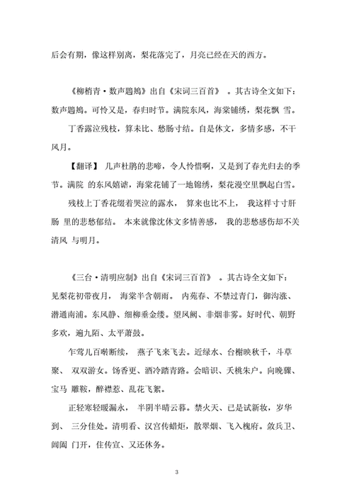 3、《破阵子·春景》作者:晏殊(宋代)燕子来时新社,梨花落后清明。译文:燕子飞来正赶上社祭之时,清明节后梨花纷飞。《采桑子·当时错》作者:纳兰性德(清代)一别如斯,落尽梨花月又西。
