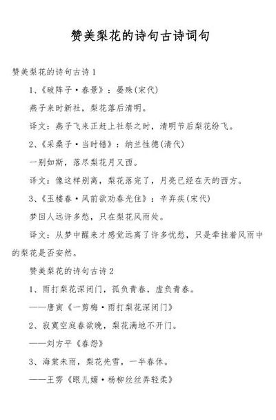 1、柳色黄金嫩,梨花白雪香。___李白《宫中行乐词八首》3 梨花自寒食,进节只愁余。___杨万里《寒食上冢》3 雪粉华,舞梨花,再不见烟村四五家。___关汉卿《大德歌冬景》3 柳叶随歌皱,梨花与泪倾。