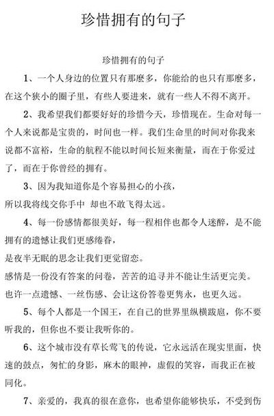 1、情深情浅,因不珍惜才散,爱浓爱淡,因不珍惜才变,不懂珍惜的人,就不配拥有真情。当你拥有时,你却不懂得珍惜。当你即将失去时,你却后悔自己以前没有珍惜。