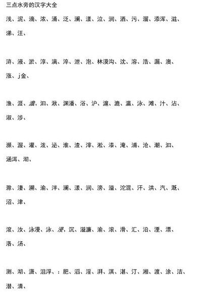 消,潇,洒,游,油,浩,涌,瀑,浦,活,冶,液,渡,波,涛,滔,渊,源,沿,沐,浴,深,淋,淩,泠,沂,浮,湖,沪,涪,浒,泭,泘,济,激,汲,洎,粒沥,溧,澧,洐,涬,溪,浠,浅,漆。