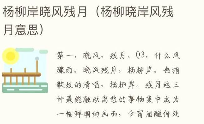 意思是:怕是只有杨柳岸边,面对凄厉的晨风和黎明的残月了。出处:《雨霖铃·寒蝉凄切》是宋代词人柳永的作品。此词上片细腻刻画了情人离别的场景,抒发离情别绪;下片着重摹写想象中别后的凄楚情状。