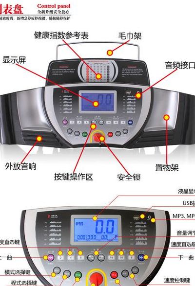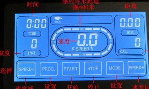 3、跑步机上的英文按键通常用于控制速度、坡度、模式等。然而,根据您提供的图片,左边这排英文按键可能并不完全准确,因为图片不够清晰。