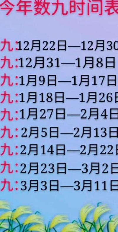 年数九时间表 2022年一九时间:2022年12月22日-2022年12月30日。2022年二九时间:2022年12月31日-2023年1月8日。2023年三九时间:2023年1月9日-2023年1月17日。2023年四九时间:2023年1月18日-2023年1月26日。