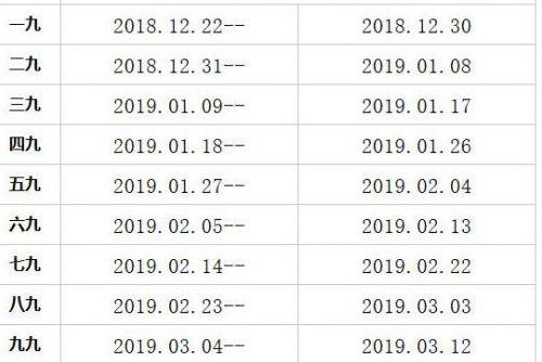 三九时间:2023年1月9日-2023年1月17日。四九时间:2023年1月18日-2023年1月26日。五九时间:2023年1月27日-2023年2月4日。六九时间:2023年2月5日-2023年2月13日。七九时间:2023年2月14日-2023年2月22日。