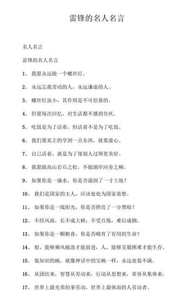 1、雷锋名言(1) 人的是有限的,可是,为人民是无限的,我要把有限的生命,到无限为人民服务之中去。(2)我愿做高山岩石之松,不做湖岸河旁之柳。我愿在暴风雨中艰苦的斗争中锻炼自己,不愿在平平静静的日子里度过自己的一生。