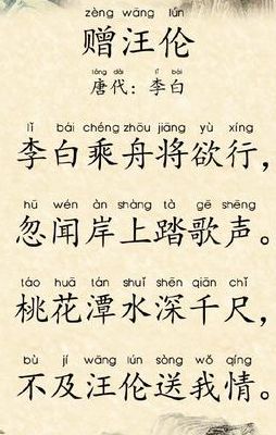 2、李白赠汪伦的诗如下:李白乘舟将欲行,忽闻岸上踏歌声。桃花潭水深千尺,不及汪伦送我情。译文:李白乘舟将要远行离去,忽听岸上传来踏歌之声。即使桃花潭水深至千尺,也比不上汪伦送我之情。《赠汪伦》此诗是唐代诗人李白于泾县(今安徽皖南地区)游历时写给当地好友汪伦的一首赠别诗。