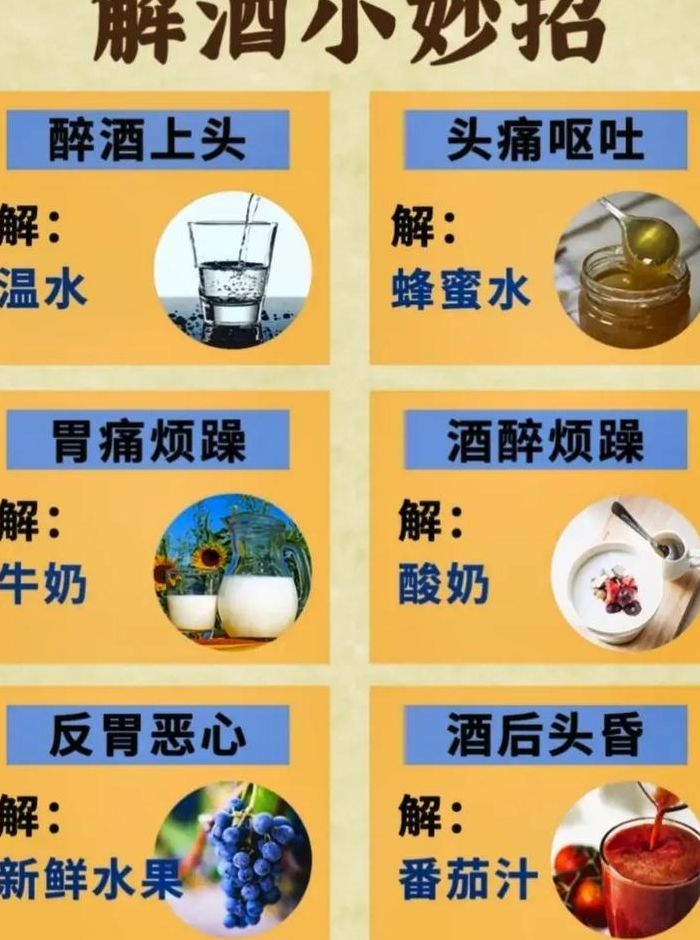 3、蜂蜜水解酒 含有一种特殊的果糖,可以促进酒精的分解吸收,减轻头痛症状,尤其是红酒引起的头痛。 豆腐解酒 饮酒多时,吃一个以豆腐为原料的菜,可促进体内的乙醇迅速排出。 酸奶解酒 酸奶能保护胃黏膜,延缓酒精吸收。由于酸奶中钙含量丰富,对缓解酒后烦躁症状尤其有效。