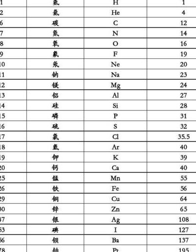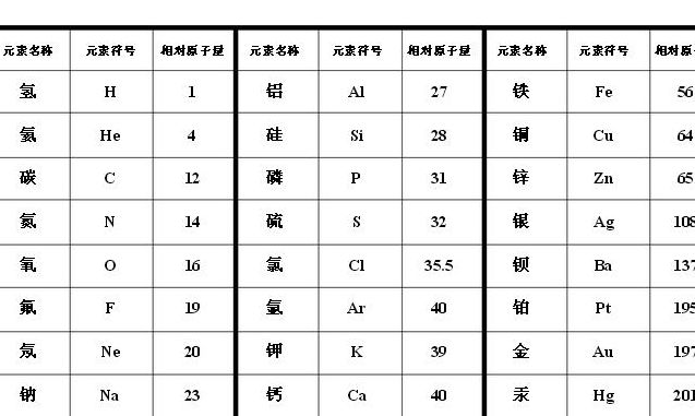 铝Al(27)、硅Si(28)、磷P(31)、硫S(32)、氯Cl(35)、钾K(39)钙Ca(40)、锰Mn(55)、铁Fe(56)、铜Cu(65)、锌Zn(65)、银Ag(108)、钡Ba(137)、碘I(127)。相对原子质量表:是指按照原子序数排列。 本表数据源自最近元素周期表,以12C=12为标准。