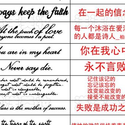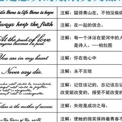 4、有意义的纹身单词有:Never put off till tomorrow what you can do today. 今事,今毕。The shortest answer is doing. 最简短的回答就是行动。Nothing is impossible to a willing heart. 心之所愿,无事不成。Where there is life, there is hope. 有生命必有希望。