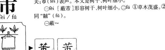 拼音:fèi,fú 解释:[fèi] 小树干及小树叶:蔽~(形容树木枝叶小而密)。[fú] 草木茂盛。