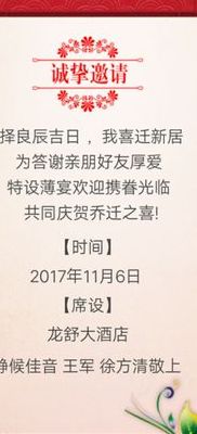 住房太小憋得慌,个头只有一米六十几,买了新房搬新家,新房里面摆酒席,乔迁之喜邀请你来参加,时间请你别忘记,某年某时,朋友们准时来啊,给我带一个女朋友呗,我的个头还有希望长高。 家是幸福的港湾,房是家庭的据点。翘首期盼,送给你乔迁的喜柬;拱手祝愿,祈愿美好的明天。