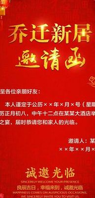 3、给大家推荐一篇乔迁之喜邀请函词范本:尊敬的[受邀者姓名],我非常高兴地宣布,我们即将迎来一个重要的生活里程碑——乔迁新居。这是我们家庭的新起点,也是我们生活的新篇章。在这个特殊的时刻,我们诚挚地邀请您来参加我们的乔迁庆祝活动。您的出席将使这个喜庆的场合更加完美。
