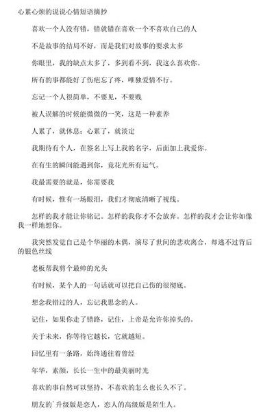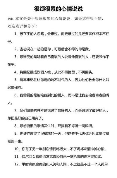 5、心里好烦好累说说【伤感篇】 爱情就像一根刺,一旦陷进去了,便很痛苦 曾经想方设法用尽心思换回你的一个笑容,现在想想都觉得可笑 我有一万种想见你的理由却少了一种能见你的身份 累了,痛了,想的多了。 挤不进去的世界,就不要挤了碍了别人的眼累了自己的心 生命颓然着一切毫无意义的事。