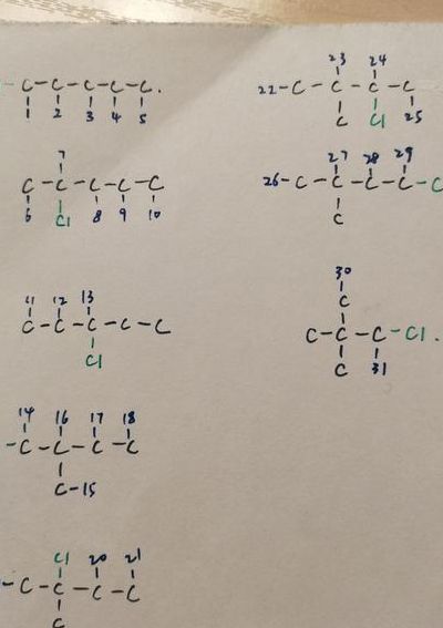 5、判断一氯代物有几种的方法是:先把氯看成氢,写出所对应该烷烃的所有同分异构体,然后排除等位碳就能确定一氯代物有几种。一氯代物是指分子中只有一个氯原子的化合物,一般指有机化合物。