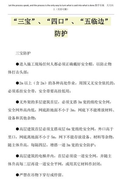 “三宝”即安全帽、安全带、安全网。“四口”即预留洞口、电梯井口、通道口、楼梯口。“五临边”即楼面临边、屋面临边、阳台临边、升降口临边、基坑临边。