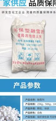 2、融雪剂一般有两大类,一类是以醋酸钾为主要成分的有机融雪剂 另一类则是以“氯盐”为主要成分的无机融雪剂 氯盐类”融雪剂的融雪原理是:“氯盐类”融雪剂溶于水(雪)后,其冰点在零度下,如,氯化钠(食盐主要成分)溶于水后冰点在-10℃,氯化钙在-20℃左右,醋酸类可达-30℃左右。