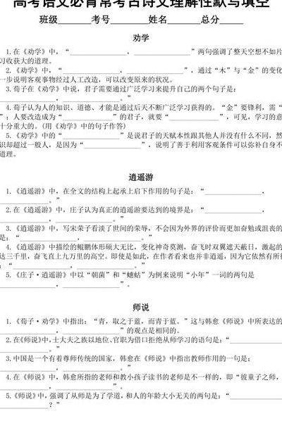 高中必背古诗文有40篇。古文:荀子.劝学 、战国策.邹忌讽齐王纳谏 、司马迁史记-屈原列传、 李密陈情表 、王勃滕王阁序、 韩愈师说、杜牧阿房宫赋、 苏洵六国论、 王安石游褒禅山记、 苏轼赤壁赋。