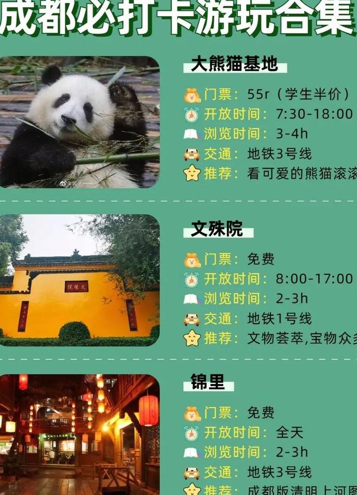 2、四川成都旅游必去十大景点推荐 我推荐以下这些景点,它们涵盖了成都的自然风光、历史文化、美食和休闲娱乐等多个方面。 熊猫基地:亲近大熊猫。 宽窄巷子:体验传统民居。 锦里:品味古代风情。 杜甫草堂:了解唐诗文化。 人民公园:感受茶文化。 乐山大佛:欣赏石刻艺术。 峨眉山:观赏日出和佛教文化。
