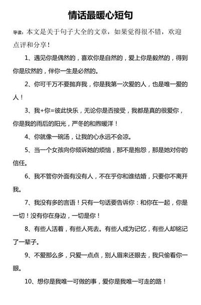 1、情话是我觉得情侣间最必不可少的调和剂,以下是我觉得最暖心的情话短句 风花雪月不等人,要献便献吻。 蓦然回首唯有你,照亮我岁月。 亲爱的,时间知道我一直陪伴你。 我爱你,点亮爱的篝火,温暖你。 你的心,是我最想要的礼物。 如果恩爱无悔,何惧世故左右。