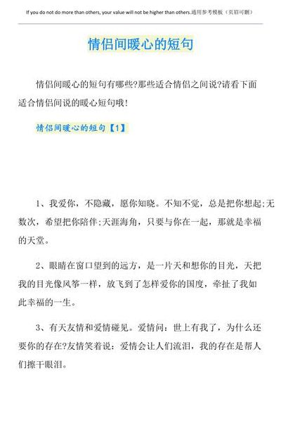 篇一:情话最暖心短句 轻轻的,一缕春风拂过面颊,激起一丝涟漪。悠悠的,带来了你的气息,在回忆里,甜甜的。当爱情来临,当然也是快乐的。但是,这种快乐是要付出代价的,也要学习去接受失望,伤痛和离别。从此,人生不再纯粹。