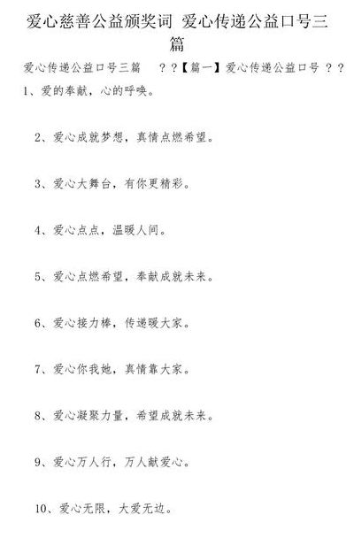 大疆有域,爱心无垠。50、慈是孝的沃土,孝是慈的回报。5语言无国界,大爱无边界。5慈善公益人人参与,奉献爱心从我做起。5做慈善事业的行动者,当爱心奉献的传播者。5幸福源于关爱,和谐来自希望。5用青春的力量,扬起希望的风帆;用真诚的爱心,托起明天的太阳。
