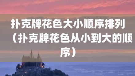 3、花色大小顺序是:黑桃红桃梅花方块 花色国际上所通行的扑克花色分别为黑桃(Spade)、红桃(Heart)、方块(Diamond)、梅花(Club),这是一种最常见的,最早出现在法国的花色。一些西方国家传统上的扑克花色略有不同。